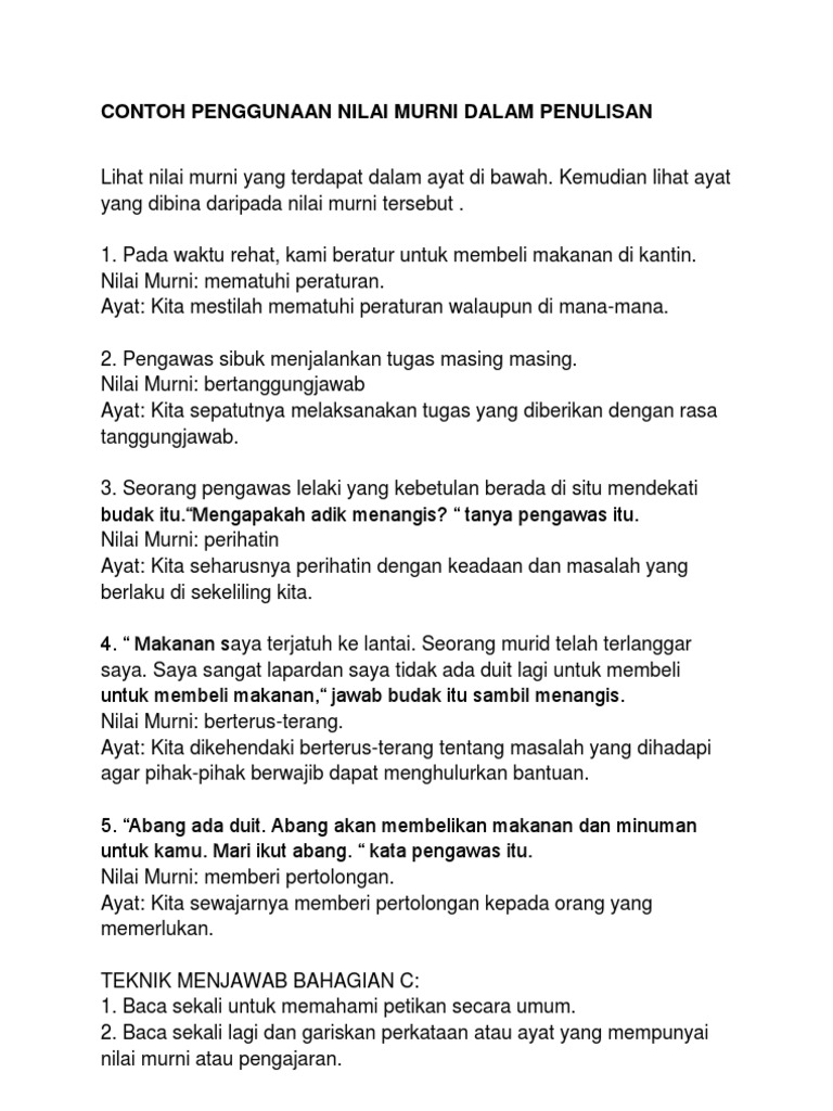 CONTOH-CONTOH CARA MENULIS NILAI MURNI PENGAJARAN. Saya sangat lapardan saya tidak ada duit lagi untuk membeli untuk membeli makanan jawab budak itu sambil menangis. NILAI DAN PENGAJARAN NOVEL MENITI IMPIAN.